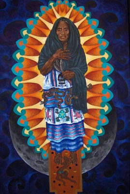 Hace su ceremonia de noche, porque entonces cuenta con la protección de las estrellas y los astros y porque sólo de la oscuridad nace la luz. Es mujer águila porque vuela muy alto, y porque ve los que otros no pueden ver. Es una abuela generosa porque abrió las puertas de la vida y la resurección a una cultura agonizante. Ella es una salvadora de nuestras tradiciones y religiones, una mujer insignia, una mujer bandera.